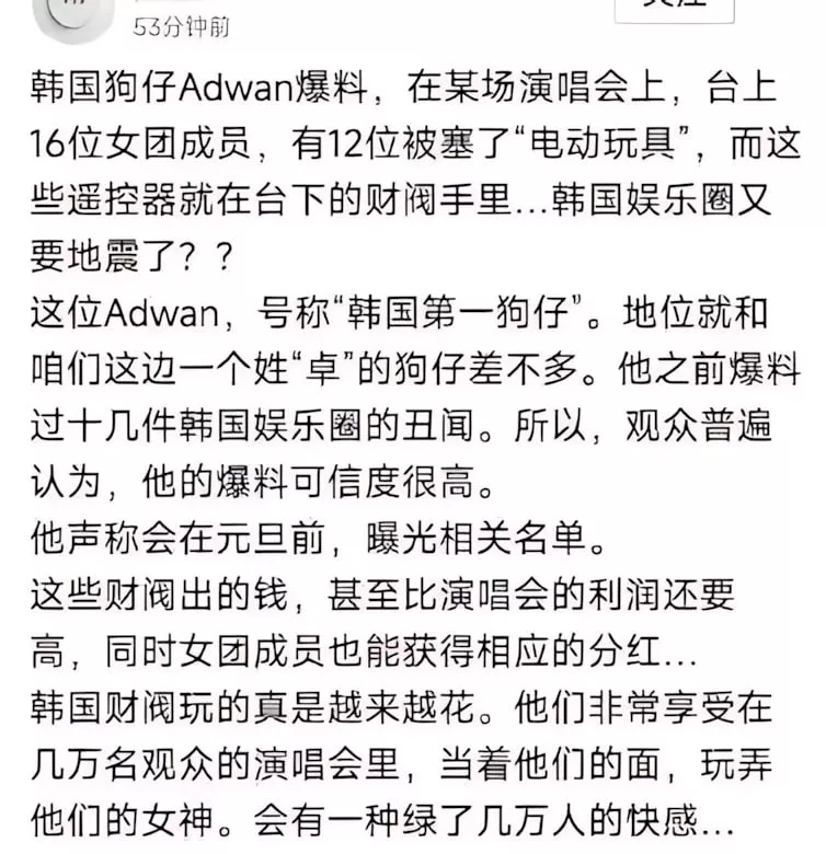 韩国知名狗仔Adwan近日爆料称,在某场演唱会上,16位女团成员中竟有12人被迫使用“电动玩具”,而遥控器则由台下的财阀掌控。Adwan自称为“韩国第一狗仔”,因揭露韩国娱乐圈丑闻而备受关注,因此他的可信度相对较高。他表示将在元旦之前公布相关名单。