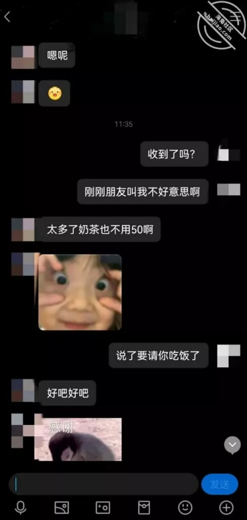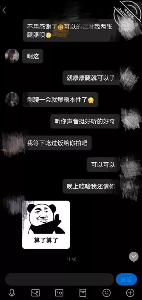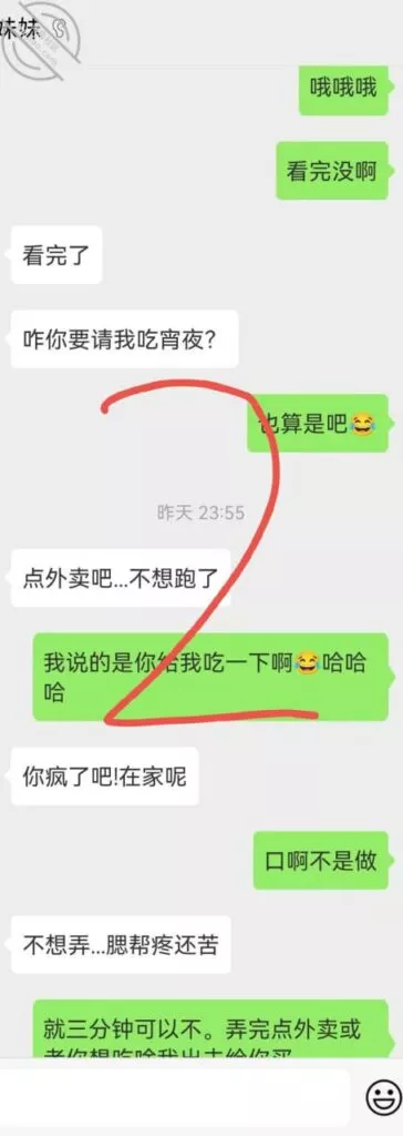 聊了一会想着请她喝个扔茶哄高兴了要个腿照试试。他给我发了个收款码好像不太想加微信。中间隔了一会没回她是去找朋友给我微信小号实名去了。想着是自己妹妹吗直接发了50,竟然真要到腿照了。