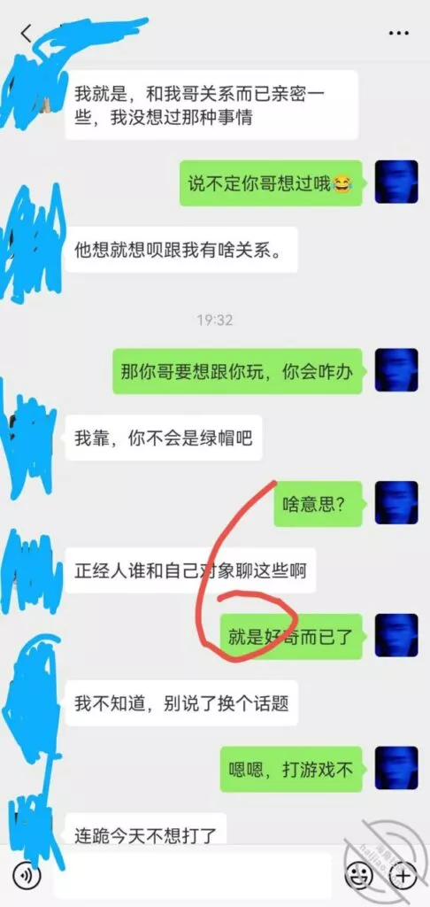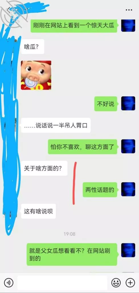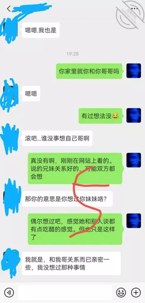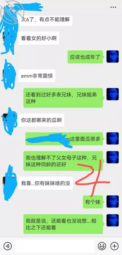 于是我和妹妹聊天过程中说在网站上看到一个大瓜,给妹妹发了过去,是一个父女的瓜,没想到妹妹说他们宿舍的最接近也看到好多错乱关系的瓜。于是借着这个话题我问了妹妹对错乱关系的看法。妹妹说对父女的有点理解不了,表哥表妹,兄妹还能看,感觉挺刺激。然后我问妹妹想过和哥哥没,妹妹让我滚。感觉妹妹可能有过想法,但是和“我”(她的网恋对象)肯定是放不开讨论这个话题的。