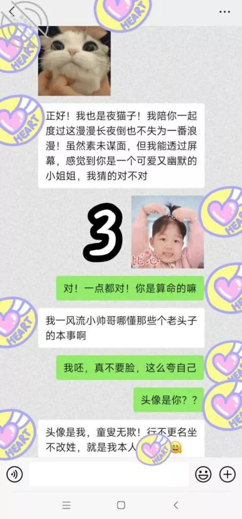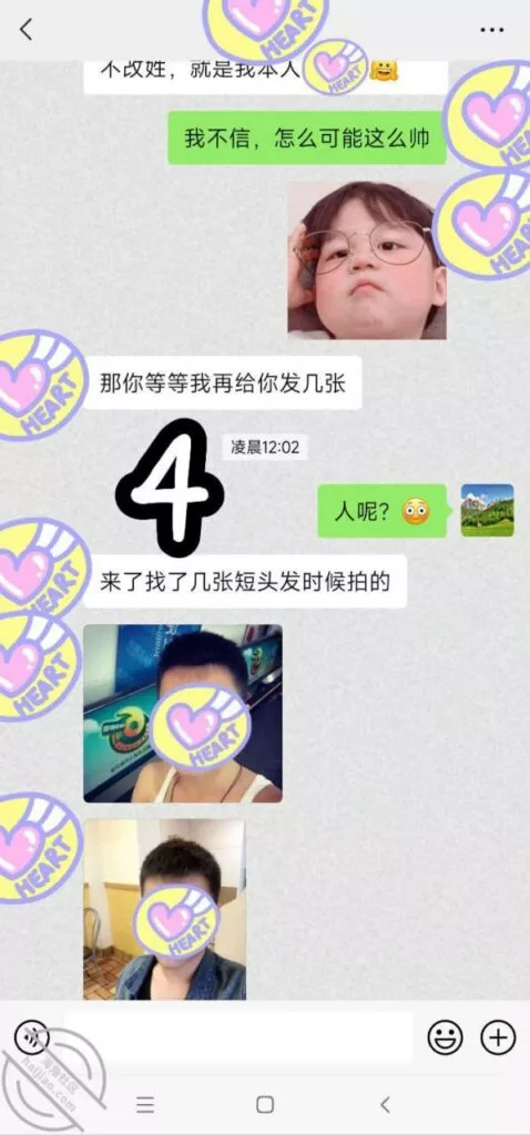 今晚上监听的内容没有什么新奇的,女儿跟那个男生一起开语音打游戏,聊天内容挺正常。今晚上女儿睡得晚,将近十一点才睡。我一直不放心这个不安好心的男生。我找出手机里之前偷拍的他微信联系方式照片,决定加上他微信,套路套路他。我把微信小号资料改成女的,头像换成可爱又性感的那种,给他发了好友申请,没一会儿他就同意了。他聊天还挺在行的,先来一套夸人的高帽子话,又用了些轻松愉快的方式,搞得气氛一点都不尴尬。一看他就是老手了,经常流窜在花丛中