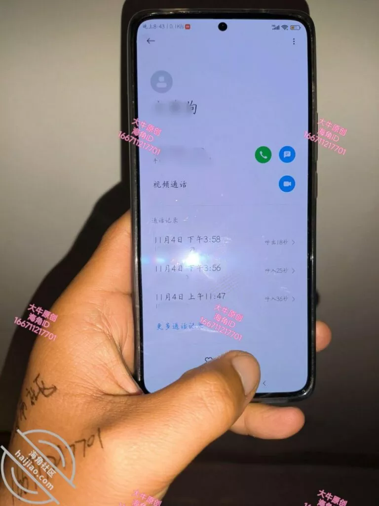 但是女儿跟其中一个男生聊的挺火热,我看到这男生经常给女儿发红包,还时不时说点黄段子,我用自己手机把这个人的二维码名片拍了下来。又打开通话记录,看到女儿跟一个备注叫**狗的人通话最频繁,我也拍了下来,通过电话号码可以确定这两个联系方式是同一个人的。