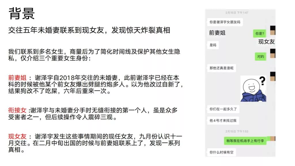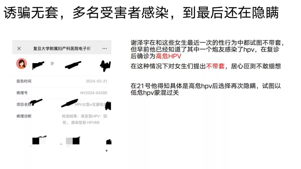 24页的PPT曝光了华东理工大学毒王谢泽宇,此人是上海211名校的学生。他的未婚妻,交往了五年,揭露了他的不堪行径:他长期与多名女性保持暧昧关系,身患性病却毫无自爱之心,利用PUA手段Cao控多位女性,从而导致她们也受到感染。同时,他还利用研究经费来贿赂他人,为自己的私利谋取便利,甚至公开辱骂自己的导师。